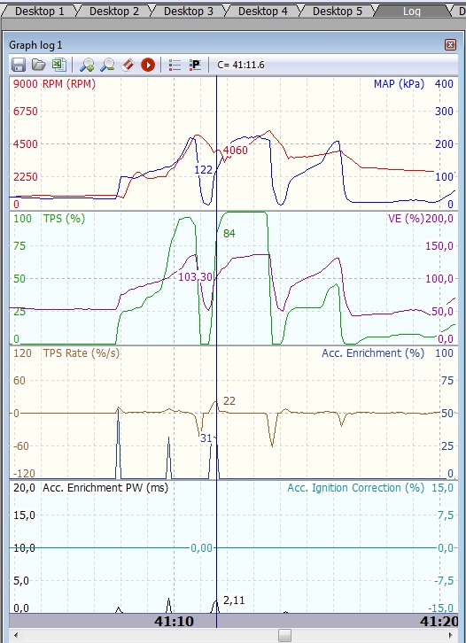 I have now uploaded the latest software. I have attached the setup and a log. It looks way better than before, but i still get a narrow spike. 18AFR at 120 kpa sounds scary. I also get a small hesitation when flooring it. A short stutter before it starts. acc enrichment.jpg acc enrichment setup.jpg