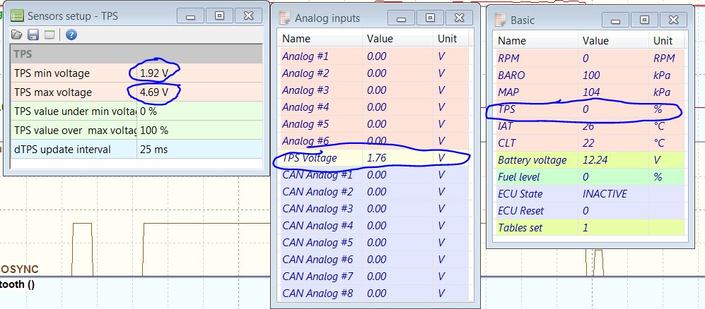 7) Your TPS min voltage doesn't look right, typically its near 0.6-0.8volts....use this attached pic to calibrate your TPS. At 0% throttle, read TPS Voltage, set that as TPS MIN...at 100%, read TPS voltage, set that as TPS MAX