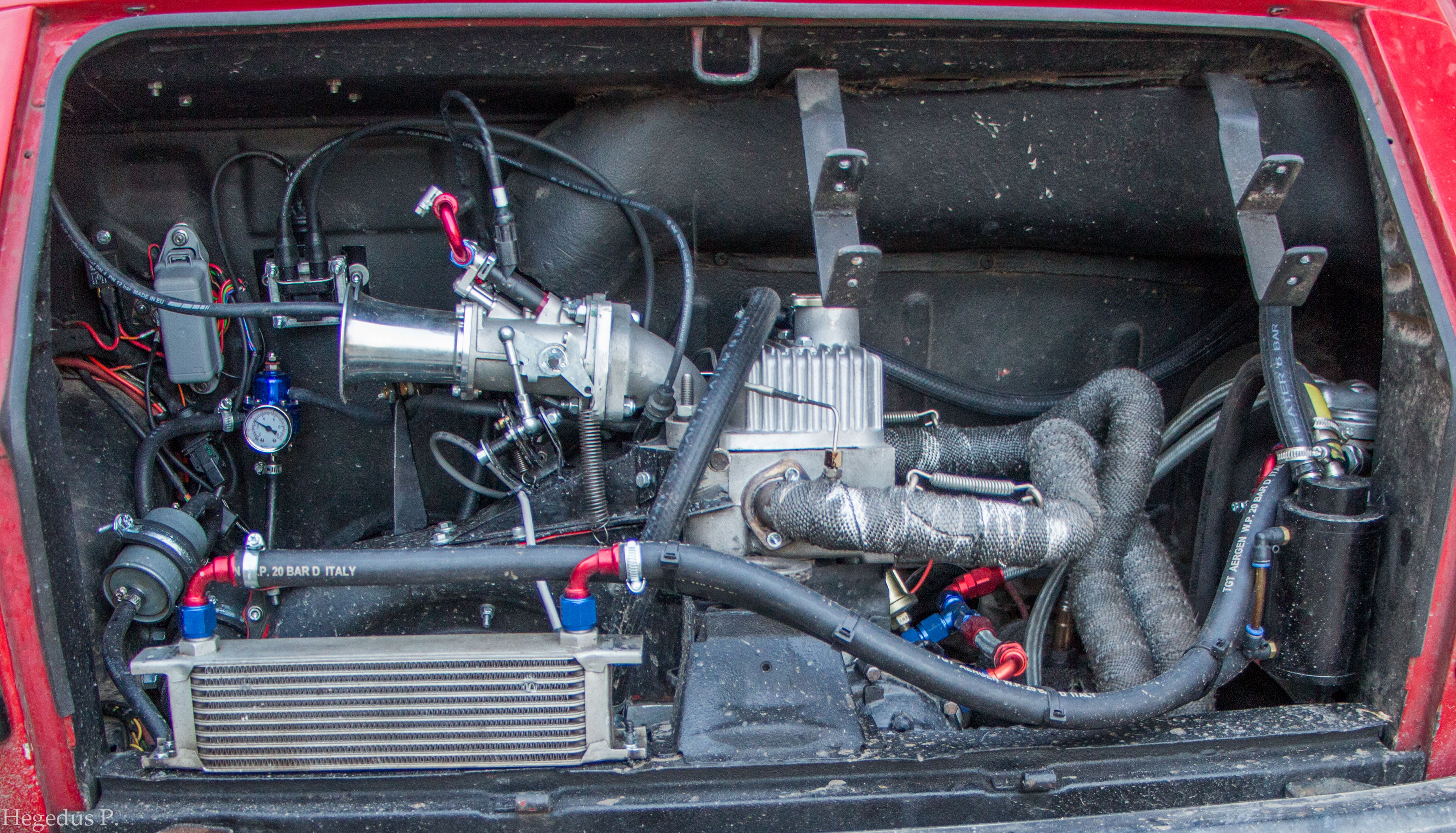Fiat 126, big bore(from 77 to 82-650cc to 740cc) forged 2ring piston with ceramic coating, forged conrod, aluminium valves with nicasil, 316° camshaft, light flywheel(3,3kg from aprox 7,5), dual port head from panda 30 with big valves (36, 30), dual 45mm throtle body, 19lb siemens deka injectors, stainles steel exhaust, external oil circuit and many others.
