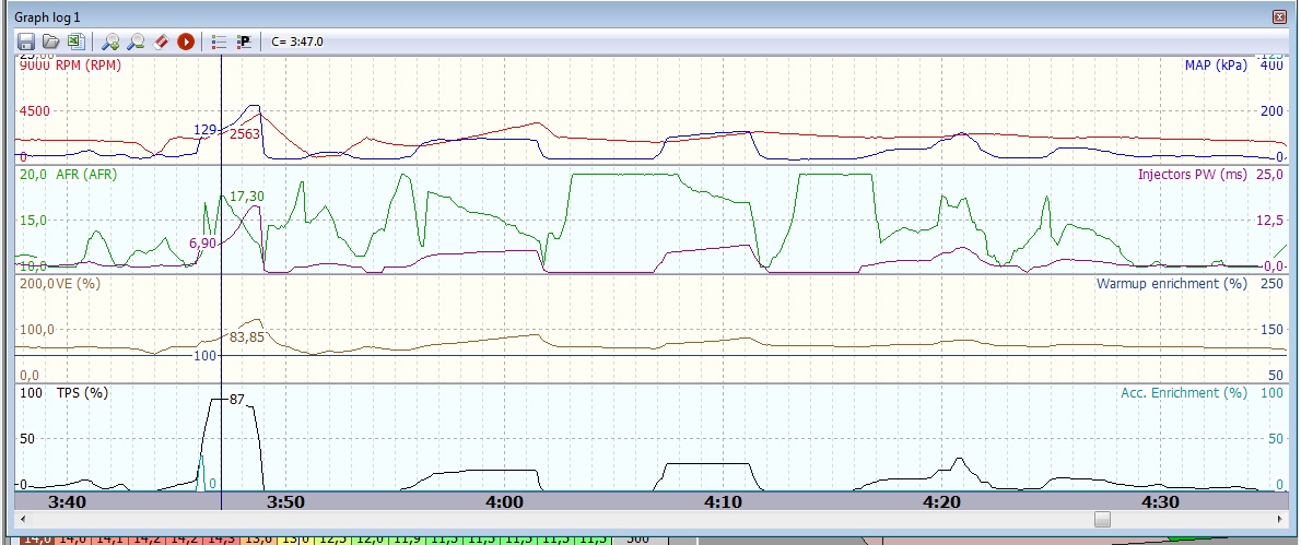 There seems to be no correspondance between target afr and actual afr. Gauge shows the same as the graf, so it is correct.