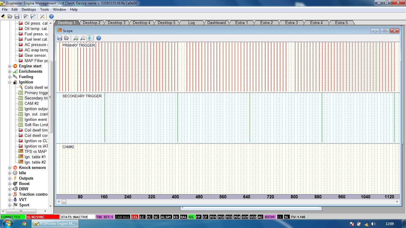 edit: i would remove the resistors on the cam and crank sensors and try reversing the edge3 on the crank trigger it looks from the scope to be wrong, since the first gap after the missing tooth is slightly larger than the others!!
