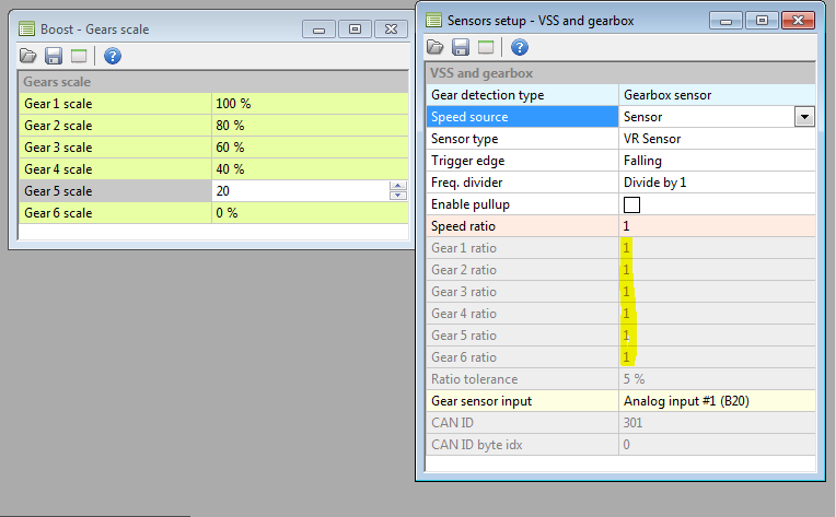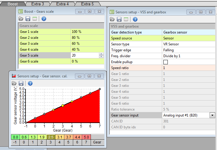 RHD wrote:There is a gear sensor input setting in the VSS and gear sensor setup you need to select one of the analog inputs, then connect a pull up resistor to power and a string of voltage divider resistors so that you get a graduated voltage signal from 0 to 5v for each boost setting you want ie 0, 1v, 2v, 3v, 4v, etc. then there is a gear calibration table that you can set the voltages to represent gears 0v=1, 1v=2, 2v=3 etc...