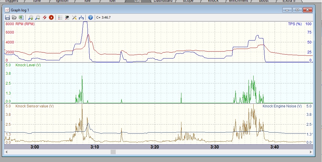 1st, go to the Log tab and open up one of your "Graph"". Before you begin driving, you will want to go back to your Knock Sensor Parameters and set up a few things. First turn your Gain to the highest setting (2.0) and turn your Integrator to 100ms (more on this later).